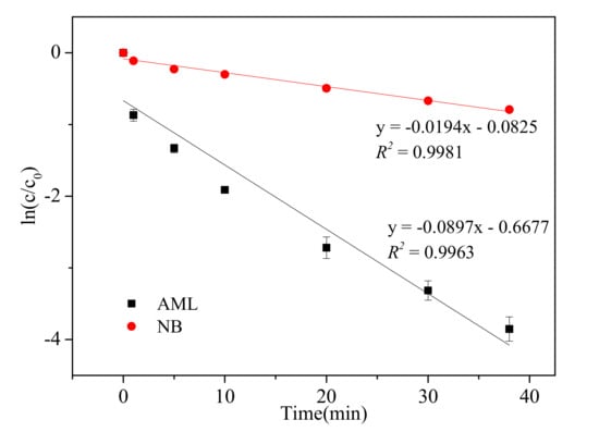where [AML]0 and [AML]t stand for the AML concentration at 0 s and t s, respectively, μM. is the pseudo-first-order apparent rate constant, min−1: