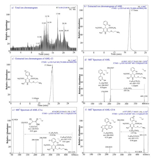 Total ion chromatogram (TIC), extracted ion chromatogram (EIC) and MS2 spectra of AML and AML-Cl obtained by HRMS. (a) TIC spectrum, (b) EIC spectrum of AML at 409.1525 m/z, (c) EIC spectrum of AML-Cl at 443.1135 m/z, (d) MS2 spectrum of AML, (e) MS2 spectrum of AML-Cl-a, and (f) MS2 spectrum of AML-Cl-b.