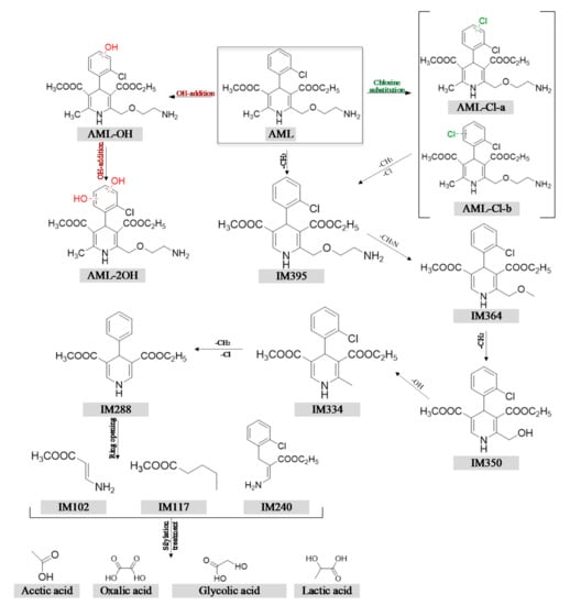 Moreover, the bi-chlorine substitution product is also a common intermediate in the UV/chlorine process [50]. However, this product was not observed in the current study. the hydroxylation reaction of AML with OH• could generate direct OH-adding products (AML-OH) (Table 1, Figure A2). In addition, OH• may further attack the benzene ring to produce dihydroxy addition product. As shown in Table 2 and Figure A2, the dihydroxy addition product at 439.1281 m/z was observed at 11.71 min (AML-2OH). Through the continuous reaction initiated by reactive species, AML and AML-Cl can further produce IM395 through de-chlorination and demethylation reactions (Table 1, Figure A2). The product of 395.1368 m/z was found at 11.97 min. Subsequently, the terminal methenamine entity on the side chain of IM395 was attacked and produced IM364 with the formula C18H20ClNO5 at 364.0961 m/z. IM364 possibly generated IM350 with the formula C17H18ClNO5 at 350.0804 m/z by O-demethylation of the side chain. Then, IM350 could produce IM334 with the formula C17H18ClNO4 at 334.0855 m/z by losing a hydroxyl group. After de-chlorination and demethylation reactions, IM334 could further produce IM288 with the formula C16H17NO4 at 288.1228 m/z. These intermediates were also detected in two AML degradation processes of UV photolysis and UV/H2O2, indicating that AML was transformed in different processes with similar degradation pathways [19,51].