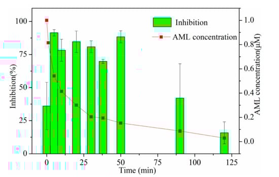 The degradation of AML was investigated under the typical conditions of a 10 μM initial AML concentration, 500 μW·cm−2 UV intensity, 30 μM chlorine dose, and a pH value of 7. Toxicity analysis of the AML water samples after the UV/chlorine process was performed using Vibrio fischeri. Acute toxicity was evaluated by the inhibitory effects on the bioluminescence intensity of the Vibrio fischeri. Figure 10 shows that the inhibition rate of the initial AML water sample was 36.0%. The inhibition rate gradually increased from 36.0% to 88.4% while AML removal reached 84.7% in 50 min, implying that the removal of AML does not guarantee the reduction in ecological risk [52]. Thereafter, the inhibition rate gradually decreased and eventually dropped to 15.8% at 120 min, which indicates that the toxicity of intermediates produced in the later stage was less than that of AML. The similar conclusion was also found in the degradation of dodecyl-benzyl-dimethyl-ammonium chloride (DDBAC) [14] and carbamazepine (CBZ) [18] by the UV/chlorine process. Toxicity tests indicates that prolonged degradation would promote the detoxification of toxic intermediates. The UV/chlorine process was taken as an effective method to remove AML and reduce ecological risk [14].