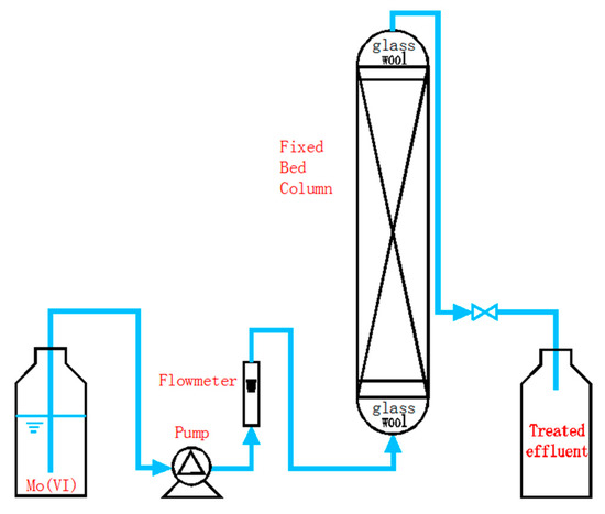 A fixed-bed column system was installed to examine the dynamic behavior of removal of Mo(VI) by NZVI/AC. The polymethyl methacrylate (PMMA) columns having an internal diameter of 1 cm and a height of 40 cm were set up for conducting column experiments. A small piece of glass wool was used to plug the column at both ends. The experimental design of the column and the components associated with it is illustrated in Figure 1. The tests were carried out at 25 ± 1 °C. A peristaltic pump (HL-1S, Shanghai Huxi Analytical Instrument Co., China) was used to attain an affixed flow rate. In order to ensure that the bed was perfectly saturated, an upward transfer of the Mo(VI) ions solution was made through the NZVI/AC beds. The tests were carried out as a function of empty-bed contact time (EBCT). Effluent samples were withdrawn at intervals to estimate the breakthrough points and for drawing breakthrough curves (BTCs). The tests were carried out until the complete saturation of adsorbents, followed by the analysis of column data.