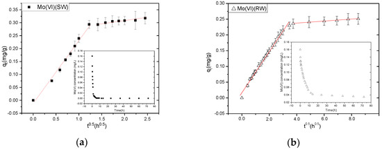 It has been illustrated by Weber and Morris that the rate-determining step in an adsorption system is intraparticle diffusion, and the amount of the substrate adsorbed (qt) varies as a function of the square root of time (t0.5) in a linear fashion. The speeds of adsorption are then calculated using these data [9]. A linear relationship was observed in a plot of qt versus t0.5 in two separate stages (Figure 2b). Therefore, to both these stages, Equation (1) was applied individually. The adsorption on the NZVI situated in the macropores corresponds to the first linear section of the graph, while the diffusion of Mo(VI) corresponds to diffusion into meso- and/or micropores. The adsorption was quick on the NZVI particles in the AC channels or macropores; however, their diffusion was rather slow into micro- and mesopores due to the blockage of most pores. Additionally, there was the involvement of the corrosion of the NZVI surface, diffusion, and adsorption in the corrosion layers. For the 1st stage, the kid values were higher than the 2nd stage, in fact, 11.99 and 22.40 times higher, respectively, in SW and RW, suggesting a higher velocity of the stage 1 reaction compared to the stage 2, thus corroborating with Figure 2.