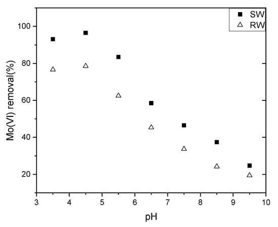 Effects of varying equilibrium pH values on Mo(VI) adsorption. Conditions: solid/liquid = 0.5 g/L, T = 298 K, initial Mo concentration in simulation water = 0.1603 mg/L; initial Mo concentration in raw water = 0.1603 mg/L.