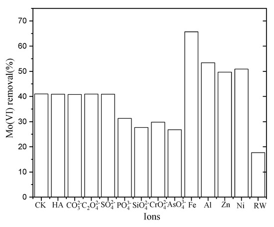 Various anions and cations are commonly present in drinking water which may positively or negatively impact the adsorption of Mo(VI). The influence of some common anions ( , ), cations (Fe3+, Al3+, Zn2+, Ni2+), and HA on Mo(IV) adsorption by NZVI/AC were examined in the current study (see Figure 4). The presence of humic acid and anions adversely affected the removal of Mo(VI). Silicate, arsenate, and phosphate caused a more adverse effect; however, the HA caused a less-adverse effect on Mo(VI) removal amongst all the oxyanions investigated in this work.