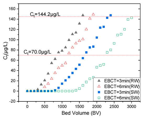 In accordance with WHO’s Mo(VI) maximum contaminant level (MCL, 70 μg/L), at a 3.0 min EBCT (empty-bed contact time), the SW and RW Mo(VI) effluent concentrations were under 70 μg/L till the empty-bed volume reached 1600 and 800 BV, respectively. The SW [Mo(VI)] and RW [Mo(VI)] concentration in the effluent solution was above 70 μg/L, at an EBCT of 6.0 min when the effluent volume reached 2300 BV and 1300 BV. The RW’s EBCTs of neither 3.0 nor 6.0 min are less than the SWs attributed to its complicated water quality composition