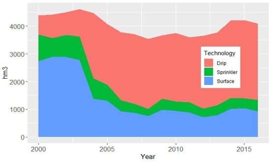To preserve the high agricultural potential of the region, public policies that encourage efficiency in the use of water, such as improvements in the water distribution system and modernisation of the irrigation systems, have been implemented over the last decades [,]. As a result, according to the Spanish Ministry of Agriculture [], by 2017, more than 84% of the total irrigated land was irrigated with sprinklers and drip irrigation systems. The above efforts of modernisation have improved the efficiency and flexibility in the use of water, as well as the profitability of the Andalusian agricultural sector []. However, the advantage gained by saving water will prove short-lived as the irrigated area will be expanded to grow high-value crops such as fruits and vegetables, which require substantial irrigation [,].