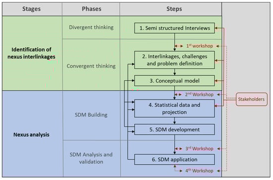 The methodological process was divided into six steps grouped into four phases: divergent thinking, convergent thinking, SDM building, and SDM analysis and validation. The first two phases provided the identification of the nexus interlinkage stage, and the last two constituted the nexus analysis stage. Figure 2 shows an overview of the steps in the process, as well as the workshops aligned within the methodological process. Due to the dynamic and interactive nature of the methodology, the process has multiple feedback loops. Constant dialogue with the stakeholders led to redefinitions of the nexus interlinkages and challenges on several occasions.