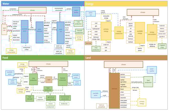 From the individual and group nexus maps, a nexus conceptual model (Figure 3) was developed (third step). In this model, the stakeholders’ and research team’s opinions were integrated. In this step, the water–agriculture link was also identified as one of the most crucial components of the nexus in Andalusia. In addition, the validation of interlinkages was based on a fuzzy cognitive mapping methodology carried out by Martínez et al. [].