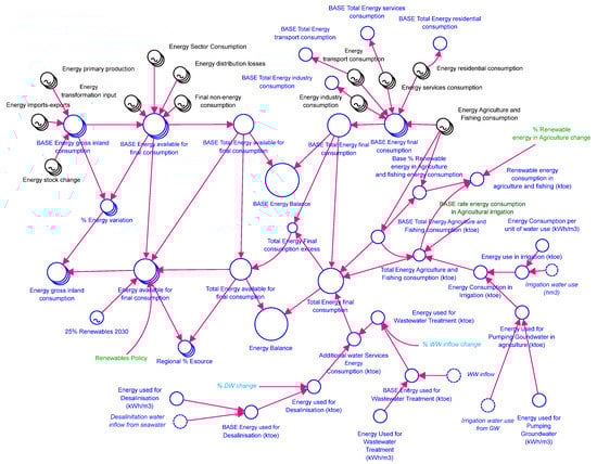 Within energy consumption, the model showed in greater detail the energy consumption by the agricultural sector, especially the consumption for irrigation. Energy consumption corresponding to the energy used for desalination and wastewater treatment was also shown.
