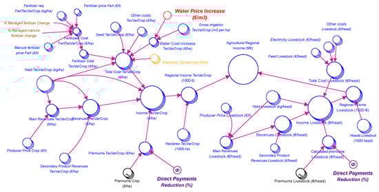 The food/land sector is the core of the model and was divided into food and land sub-sectors. The food sub-sector (Figure 6) is focused on the productive and economic aspects of the agricultural sector, such as the yields, costs, revenues, and incomes per activity and per hectare. In addition, it is the most strongly interrelated with the rest of the sectors (e.g., agricultural energy consumption with the energy model and the use of water for irrigation with the water model). The activities modelled included 33 crops and 14 livestock activities. Each of these activities had its own sub-model to better represent the particular conditions of production. Despite simulating livestock, this research focused more on crop activities. In this sense, for crops that require irrigation, differentiation in the amount of irrigation water required was made. Therefore, there were certain crops with two variants, i.e., irrigated and rainfed. Data projections for prices, premiums, yields, and cultivated hectares were taken from other models (as explained in Section 3.3, in food/land data sources), but were calculated in the SDM through linear interpolations. Variables such as gross irrigation, fertilizer requirements, secondary revenues, and specific costs were calculated in the model with constants as the functions from the yields for each crop. To calculate the economic effects of the sector in the region, the average income from crops was calculated according to Equation (3).