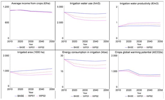 Looking at the baseline (BASE) in Figure 7, the average income from crops showed a slight long-term decrease. There was a more pronounced decline between 2020 and 2030, which was mainly due to the decrease in income from vegetable crops, which are highly dependent on water resources. The highest value, €1050/ha, was observed in 2020, and the lowest, €975/ha, was observed in 2050. Irrigation water use and energy consumption for irrigation showed similar slightly negative trends. Irrigation water use was around 3850 hm3, and energy consumption for irrigation was around 24.5 ktoe. However, a steady increase in the irrigated area was observed, from 915 thousand ha in 2010 to 1140 thousand ha in 2050. Irrigation water productivity remained steady throughout the analysed period at around €0.81/m3. Finally, the crops’ GWP showed a strong decrease, notably between 2020 and 2030. It decreased from 1100 ktCO2e to 830 ktCO2e and then remained constant until 2050.