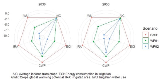 Radar charts allowed the simultaneous analysis of synergies and the trade-offs between different indicators among the scenarios. Figure 8 shows the radar charts of the model results for years 2030 and 2050. The analysis consisted of evaluating the standardized variation of the indicators with respect to the baseline. Looking at the temporal aspect, greater long-term (2050) variations compared to medium-term (2030) variations could be seen. For the synergy analysis, for the average income from crops, a water price increase in both the WP01 and WP02 scenarios causes a decrease of 0.7% and 2.2%, respectively, over the baseline by 2050. Irrigation water use decreased by 13.9% and 26.7%, energy consumption in irrigation decreased by 14.3% and 26.9%, and the irrigated area decreased by 14.4% and 28.2% in the WP1 and WP2 scenarios, respectively, by 2050. Decreases in crop GWP were also observed; WP1 decreased by 7.3%, and WP02 decreased by 12.5% over the baseline by 2050. In addition to the radar chart results, irrigation water productivity increased by 11.7% for WP1 and 23.9% for WP2 over the baseline by 2050.