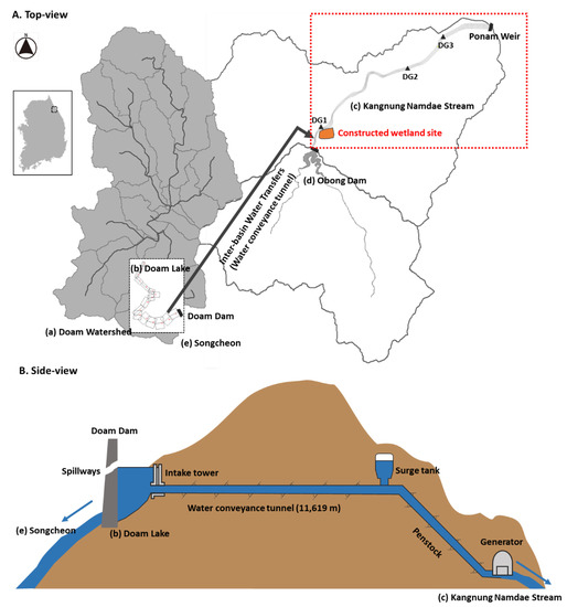 Kangnung Namdae Stream watershed has an area of 256.11 km2, which consists of 75.2% forest land and 17.1% agricultural area. The ten-year (2008–2017) mean annual temperature was 13.5 °C and the precipitation was 1245.8 mm, with approximately one-third of the amount occurring from July to August. Kangnung Namdae Stream is located between the mountainous area and the shore side of the East Sea. The stream combines two incoming tributaries at the Obong Dam and releases some of the water to mix with the discharged water of the Kangnung Hydroelectric Power Plant. As the Obong Dam serves as a supplier of the water flow to the stream, it is important to release the proper amount of water to maintain the function and state of the stream under normal conditions. The Obong Dam, however, has supplied a water flow amount below that of the instream flow, with the result that the Kangnung Namdae Stream has suffered severe water pollution [17].