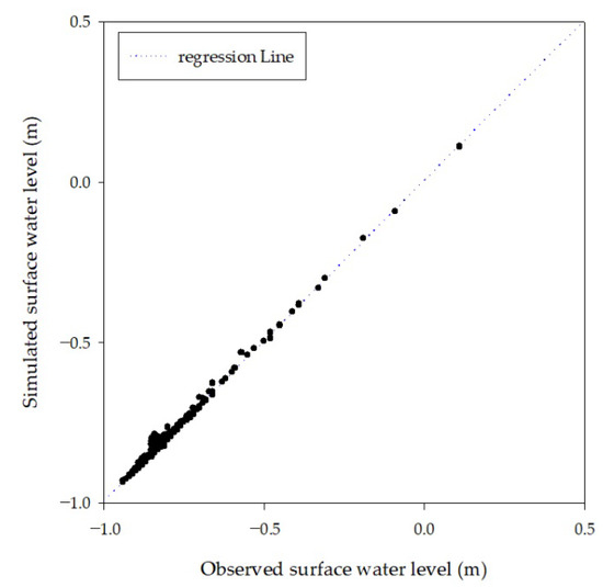 Results of the EFDC model calibration for the surface water level in Kangnung Namdae Stream.