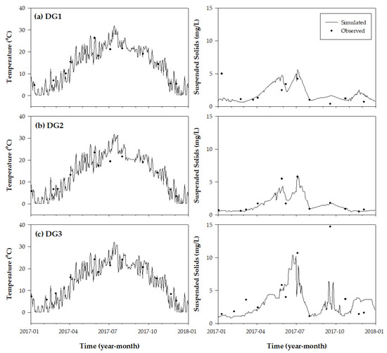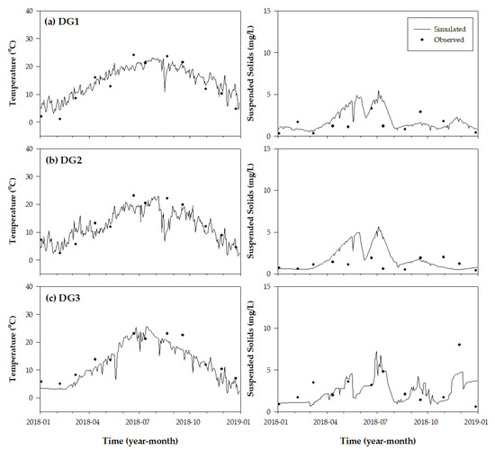 Results of the EFDC model calibration for the temperature and suspended solids (SS) concentration in Kangnung Namdae Stream at (a) DG1, (b) DG2, and (c) DG3.