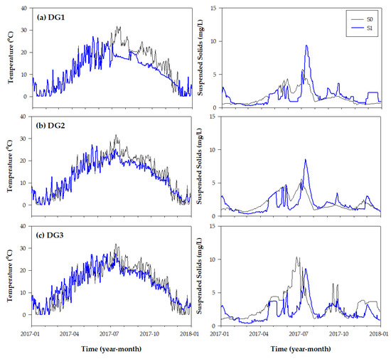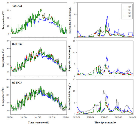 Comparison of the temperature and SS concentration under the in-lake management practices in Doam Lake and the installation of constructed wetlands in Kangnung Namdae Stream at (a) DG1, (b) DG2, and (c) DG3.