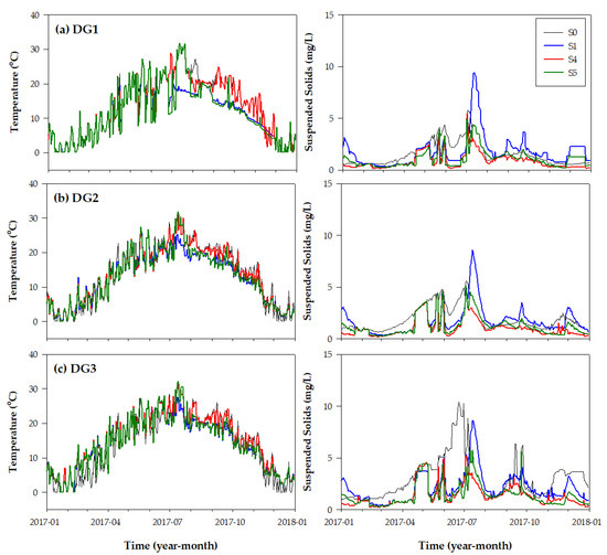 Figure 5 shows the temperature and SS concentration of Kangnung Namdae Stream in scenarios in which the power generation is not operational (S0) and after the power generation is restarted (S1). The S1 scenario supposes a situation in which the effluent is discharged at EL. 673 m through inter-basin water transfers from Doam Lake to Kangnung Namdae Stream. Water temperatures measured after power generation resumption were predicted to be lower than the original water temperature due to the discharge from the middle layer of Doam Lake in the summer season (July, August, and September). At the DG1 site, the temperature difference between the S0 and S1 scenarios varied from 0.2 to 13.6 °C, with an average of 6.2 °C owing to the direct effect of the discharged effluents without the selective withdrawal control. The DG2 and DG3 sites differed in the range of 0.1–8.3 °C and −0.3–6.6 °C, and the means were 3.7 °C and 3.1 °C, respectively. It is expected that the effluents flowing through a relatively shallow depth of the river diminish the water temperature difference by the discharge, thereby stabilizing the air temperature and heat balance. These results imply that low-temperature effluents may adversely affect the ecosystem. Therefore, a retention pond such as a wetland is necessary to stabilize the water temperature.