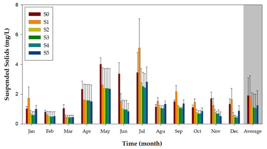 The SS concentration at the DG1 site increased from an average of 1.6 to 1.8 mg/L after the effluent discharge, and the maximum concentration greatly increased from 5.8 to 9.4 mg/L during the summer time. On the other hand, at the DG3 site, which is located downstream, the average SS concentration decreased from 3.0 to 2.1 mg/L as the effluent discharge resumed, and the maximum concentration decreased from 10.4 to 8.7 mg/L. Downstream of Kangnung Namdae Stream, there is a weir named Ponam that prevents the backflow of seawater and maintains the river level; it disturbed the stream flow smoothly before the discharge of the power generation effluents. Therefore, it had high values of SS concentrations, as the soil flowing down from the Kangnung Namdae Stream basin in the summer rainfall could not be discharged to the sea. It is predicted that the increase in flow rate due to the effluent discharge helped to decrease the downstream SS concentration.