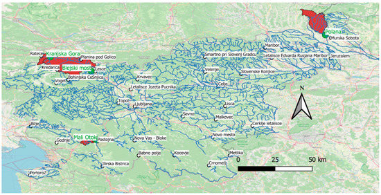 Location of the considered meteorological and climatological stations (white dots) and location of four selected catchments (red areas, green dots show water level gauging stations) with a river network in Slovenia (blue lines).
