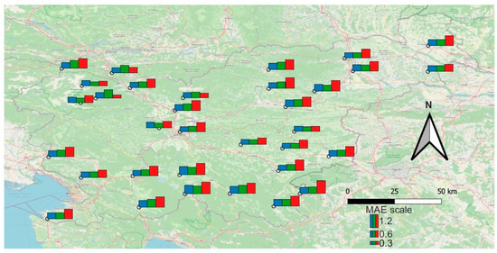 Equation (3) as well as Equation (2), which is also very frequently used in Slovenia for the calculation of the mean daily air temperature, both yield similar MAE values in case Equation (1) results, which are used as a “true” mean daily air temperature estimates. The mean MAE values were around 0.55 °C. Moreover, MAE values using Equation (4) are larger for most of the analysed stations (i.e., mean MAE was around 0.80 °C). Furthermore, no geographical pattern could be observed based on the presented results.