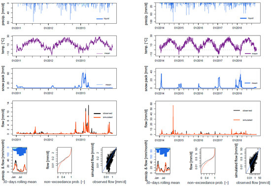 Evaluation of the CemaNeige GR6J model for the calibration (left) and validation (right) period. Top two panels show input precipitation and air temperature data. Middle panel shows modelled snow pack values. Lower two panels show a comparison between simulated and observed discharge data using daily discharge values, 30-days rolling mean, flow duration curve, and scatter plot.