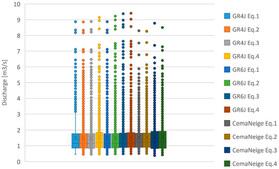 All the calculations that were carried out in the scope of this part of the study were performed for the Blejski station on the Sava Dolinka river. The first step was the evaluation of the impact of the performance criteria used for the model calibration. KGE, KGE2, and NSE were applied and compared to the results obtained using RMSE (i.e., using Equation (1) for the mean daily air temperature determination in all cases). The differences in the mean simulated discharge values were in the range of 2%, while the differences in the maximum discharge values were much larger and within the range of 30% (Figure 7). These differences in the maximum discharge values also yielded differences in the overall model performance. In a similar manner, the impact of the length of the model warm-up period on the results was also evaluated (Figure 7). In this case, the differences in the mean simulated discharge values were in the range of 6% and were larger for the CemaNeige GR6J model than for the GR4J and GR6J models. Additionally, differences in the maximum simulated discharge values were in the range of 20%, which also impacted the model performance. The results show that performance criteria used in the process of model calibration and the length of the warm-up period had a larger effect on the model results than selection of the equation used for calculating the mean daily air temperature (Section 3.2). Similar results would be expected in the case of shortening or extending the length of the calibration period [40]. However, some studies have indicated that shorter periods could be sufficient for efficient model calibration [41,42]. Moreover, use of a different calibration method would likely also have a relatively significant impact on the rainfall-runoff modelling results [43,44].