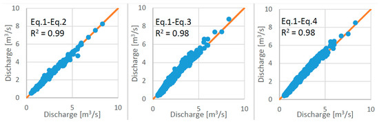 Comparison among the CemaNeige GR6J results for the Kranjska Gora station on the Sava Dolinka river using different input values for the mean air temperature estimates. X-axis in all three cases show results obtained using Equation (1) while the y-axis show results using Equation (2), Equation (3), and Equation (4) (from left to right).
