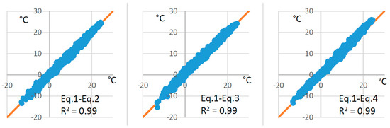 Comparison of mean daily air temperature values for the Rateče station on the Sava Dolinka river using different input values for the mean air temperature estimates. In all three cases, the x-axis shows the mean daily air temperature estimates using Equation (1) while the y-axis show values obtained using Equation (2), Equation (3), and Equation (4) (from left to right).