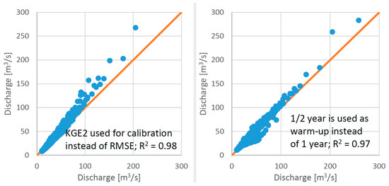 Impact of the efficiency criteria used for the CemaNeige GR6J model calibration (left figure) and impact on the length of the model warm-up period (right figure) on the model results in the validation period for the Blejski most station on the Sava Dolinka river. In both cases, the x-axis shows discharge values obtained using Equation (1), RMSE as a criterion for the calibration, and one year as a warm-up period. In the left figure, the y-axis shows the results using the KGE2 for model calibration. In the right figure, the y-axis shows the results using half-year data for the model warm-up period instead of one year.