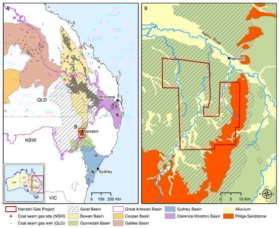 Geological basins and existing coal seam gas developments in Queensland and New South Wales (A), and outcropping extents of alluvial and Pilliga Sandstone aquifers in Australia near the Narrabri Gas Project area (B). Data sourced from [].