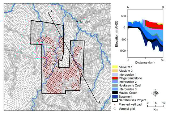 Voronoi model grid structure and hydrostratigraphy of the Narrabri Gas Project area.