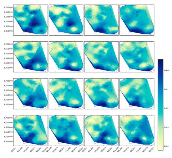 Turnadge et al. [] derived porosity-permeability relationships based on downhole porosity logs obtained from 97 exploration wells located across the Gunnedah Basin. They evaluated approaches to upscale these well-scale vertical hydraulic conductivity (Kv) values for inclusion in a regional-scale numerical groundwater model for the Gunnedah and Surat basins. Furthermore, they used this upscaled data to fit geostatistical models to characterize the spatial co-variance of hydraulic properties in the sequences. A spherical variogram with a Sill of 0.764, Nugget of 0.327 and Range of 129 km was used to define the co-variance structure of hydraulic properties horizontally in different model layers. In our highly parameterised modelling scheme, we used this spherical variogram to underpin the spatial covariance structure for interpolating values from the pilot points. A total of 1672 model parameters were used in this highly parameterized scheme. Examples of realizations of the hydraulic conductivity for model layer 6 representing the Pilliga Sandstone aquifer obtained in this manner are shown in Figure 3.