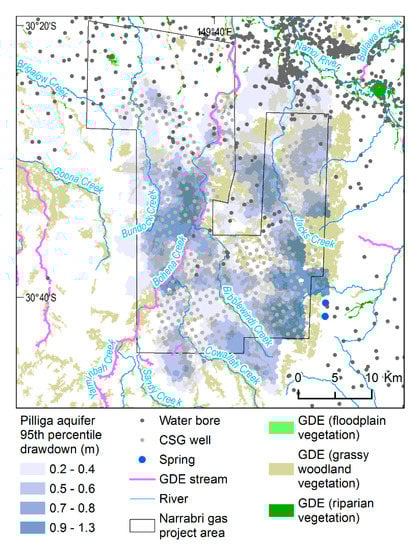 Probabilistic groundwater model simulations calculated groundwater head drawdown in the Pilliga Sandstone aquifer as a result of CSG well development and defined an impact threshold based on a >5% chance of drawdown of >0.2 m occurring in the Pilliga Sandstone aquifer (Figure 4). This threshold is consistent with the most conservative minimal impact threshold in the New South Wales Aquifer Interference Policy []. Drawdown estimates at the 95th percentile level indicated the area where the threshold of 0.2 m would be met or exceeded would intersect with 106 water bores and 1437 km2 of GDE areas (including overlapping extents) and no springs (Figure 4).