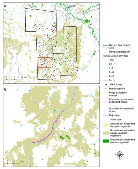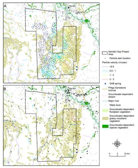 Particle velocities from multiple forward tracking simulations over 100 years released from planned CSG wells into the Pilliga Sandstone aquifer shown at regional scale (A) and local scale (B).