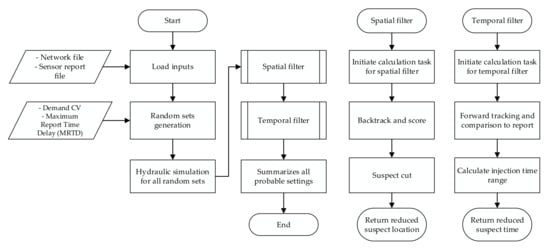 As shown in Figure 1, the spatial filter is one of the major focuses of this process and is used to identify every possible suspect injection location (SiL) and suspect injection time (SiT), considering the generated random sets of hydraulic conditions (water flow) and report time. Operations such as backtracking, scoring, and comparison are performed on the generated random sets to minimize the number of SiLs. Backtracking is performed to determine the potential SiLs, and scoring measures the likeliness of each SiL as a true injection point. Subsequently, a comparison process is applied to narrow down the suspects.
