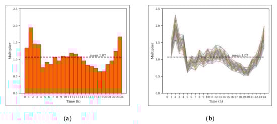 Nodal water consumption daily pattern: (a) Average pattern and (b) Randomly generated patterns.