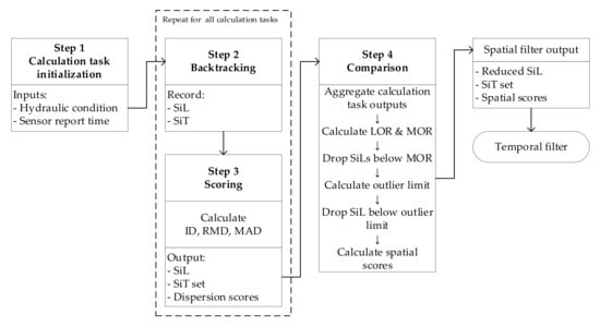 A new set of calculation tasks is initiated for the temporal filter. The input to the calculation task is in the form of a random set identifier (R.Set ID), SiL, and SiT set, obtained from the spatial filter. For a single SiL, there will be sets of SiTs equal to the number of random sets, as seen in Table 3. Thus, considering all the SiLs, the number of calculation tasks will be equal to the number of SiLs multiplied by the number of random sets. According to the random set identifier, the related hydraulic condition and sensor report time are loaded into the calculation task for comparison. Steps 2 and 3 describe the process in each calculation task.