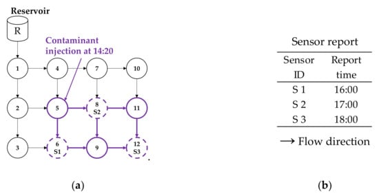 Sample data for illustration: (a) Sample water distribution network (WDN) and (b) Sensor report time.