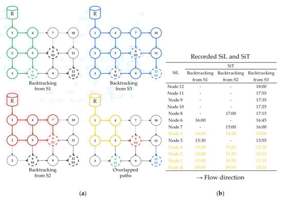 Backtracking results of the sample network: (a) Backtracking paths and (b) Recorded SiL and SiT.