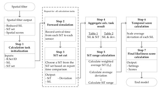 After crossing the spatial filter, the final SiLs are narrowed down (e.g., Nodes 1, 2, 3, 4, and 5 for the sample network). The spatial filter outputs the final SiLs with a set of SiTs calculated from the generated random sets, as listed in Table 3. The temporal filter aims to reduce the SiT into a minimized time range for each SiL, as shown in Figure 1. The overall process of the temporal filter is illustrated in Figure 6, followed by the explanations of each step.