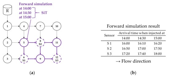 The forward simulation is conducted starting from the SiL for each SiT. The contaminant is assumed to be injected into the SiL at SiT, and the contaminant flow paths are traced in the forward time and direction. The first arrival times at the sensor locations are recorded and compared with the sensor report time. Figure 7 illustrates the forward simulation applied to Node 5 of the sample network.