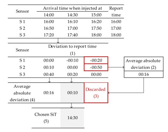 Each forward simulation will create a different set of arrival times for each sensor. Subsequently, the forward-simulated arrival times are compared with the actual report time of each sensor to measure the error (deviation). Figure 8 illustrates the SiT set cut process applied at Node 5, and the descriptions are as follows: