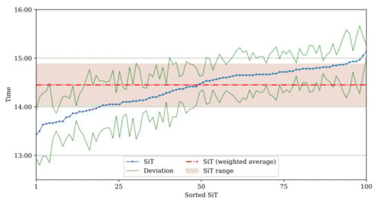 The average deviation values are then calculated and applied to the weighted average SiT () to create the minimum and maximum SiT range. Figure 9 illustrates the SiT range of Node 5 (SiL) in the sample network. The SiT values (blue line) are sorted in ascending order along with the corresponding deviation values (the two green lines represent the upper (=SiT + Dev.) and lower limits (=SiT − Dev.)). After applying Equation (7), the weighted average SiT () is found to be 14:27 (dash-dot red line), and the average deviation was calculated to be 26 min. Thus, the final SiT ranges from 14:01 to 14:53, as indicated in the shaded interval in Figure 9.