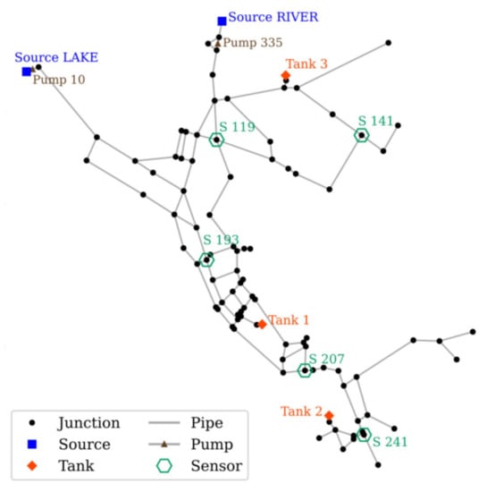 The daily requirement of potable water is fulfilled by water distribution networks (WDNs). Therefore, it is of utmost importance that the water supplied is of acceptable quality. The presence of contaminants in the network, either accidentally or deliberately, is potentially dangerous with significant health and economic consequences. Contaminants in a WDN can be introduced through several pathways, such as directly from the water treatment, cross-connection, leak/break, and storage []. Deliberate introduction of a contaminant into a WDN can occur through a direct physical attack or a cyber-physical attack, causing changes in the network operation [].