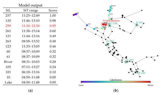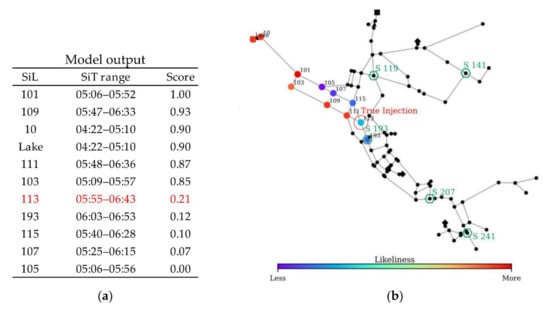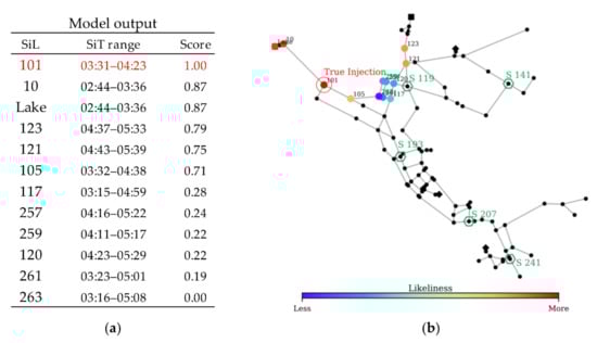 The model indicated 12 SiLs during the simulation. The SiT range and the likeliness score of each SiL are provided in Figure 11. The most likely injection location is identified as Node 101, which coincides with the true injection point. Regarding the injection time estimation, the model yielded an injection time range of 03:31–04:23 for Node 101, which is close to the true injection time of 04:00. The model runtime for this scenario with 100 random sets was 14 min.