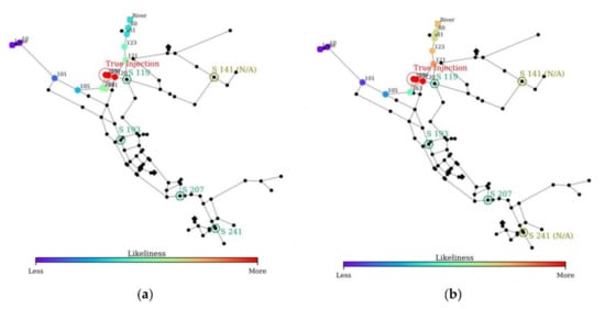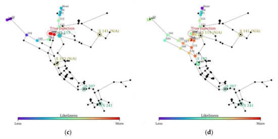 The model simulation yielded 11 SiLs, with Node 101 identified as the most suspicious location, which is far upstream from the true injection node (Node 113). The model failed to pinpoint the true injection node and localize the potential area in this scenario. As observed in Figure 13, though the true injection node is identified as an SiL, the likeliness score is minimal (0.21) because of two factors. First, the available sensor report information was not sufficient because only three sensor reports were utilized. Second, the sensor reports were all delayed for more than 1 h, thereby making the upstream node as the most suspicious location. This scenario reveals that sensor information (e.g., number of sensor reports, sensor layout, and sensor accuracy) significantly affects model performance. The simulation time for this scenario with 100 random sets was 5 min, which is considerably lower than that for the previous scenarios. This indicates that the model simulation time depends on the number of reporting sensors and identified SiLs.