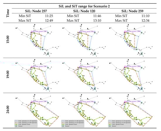 The identified contamination setting (i.e., SiL and SiT) can be used to estimate the contaminated area in the network at certain times. The area contaminated by the three high-ranked SiLs and the corresponding SiT ranges in scenario 2 are estimated and compared in Figure 15. The actual contamination path by the true injection location and time (Node 259 at 12:00) are also identified in the figure for comparison. The potentially contaminated area was estimated using a forward simulation for all the random sets of water flow to determine the maximum possible range. Figure 15 depicts the extent of contamination for three different settings over time.