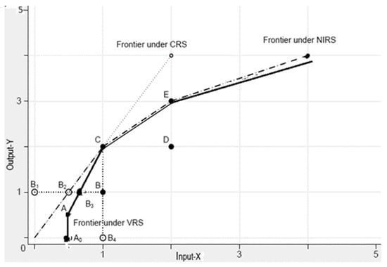 In Figure 1, as explained by Ji and Lee [], only point C is efficient under CRS production technology; points A, C, and E are efficient under VRS; and point E is efficient under decreasing returns to scale (DRS). Point B is inefficient and is operating under increasing returns to scale (IRS). Input-oriented efficiency relative to the VRS frontier can be defined as ; relative to the CRS frontier, it is defined as , where indicates the proportion of input that can be reduced while achieving the same output level. The terms with overbar indicate the Euclidean distance between the two points. They can be calculated using an appropriate formula depending on the dimension of the space as defined by the number of inputs and outputs. Additionally, CRS technical inefficiency can be decomposed into scale efficiency and pure TE. For example, and contribute to the TE of B under VRS and CRS technology, respectively, and contributes to scale efficiency. Indeed, efficiency is the measure of relative distance to the frontier.