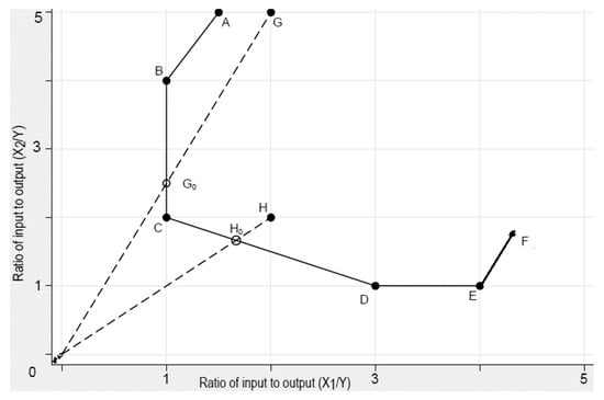 The TE of G and H can be defined by the expressions and , respectively. Although point is Farrell efficient (the efficient DMU in the frontier as measured by radial DEA model) (“Farrell efficient” indicates the efficient unit in the frontier as measured by classical DEA model. In simple words, Farrell [] defined two measures of technical efficiency (input-based and output-based) assuming CRS. An efficient DMU under this condition is referred to as Farrell efficient. The input-based measure considers scaling inputs of inefficient units projecting the point radially to the frontier without changing output level, and the output-based measure considers scaling outputs of inefficient units projecting the point radially to the frontier without altering the inputs level.), input can be reduced further while achieving the same level of output. In this case, is the input slacks for farm G. The first stage DEA model calculates the efficiency residually by disregarding the slacks. The Russell measure takes into account these possible slacks.