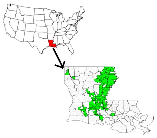 Map of the U.S. contiguous states with the State of Louisiana highlighted in red. The study area under consideration in Louisiana is shown in green.
